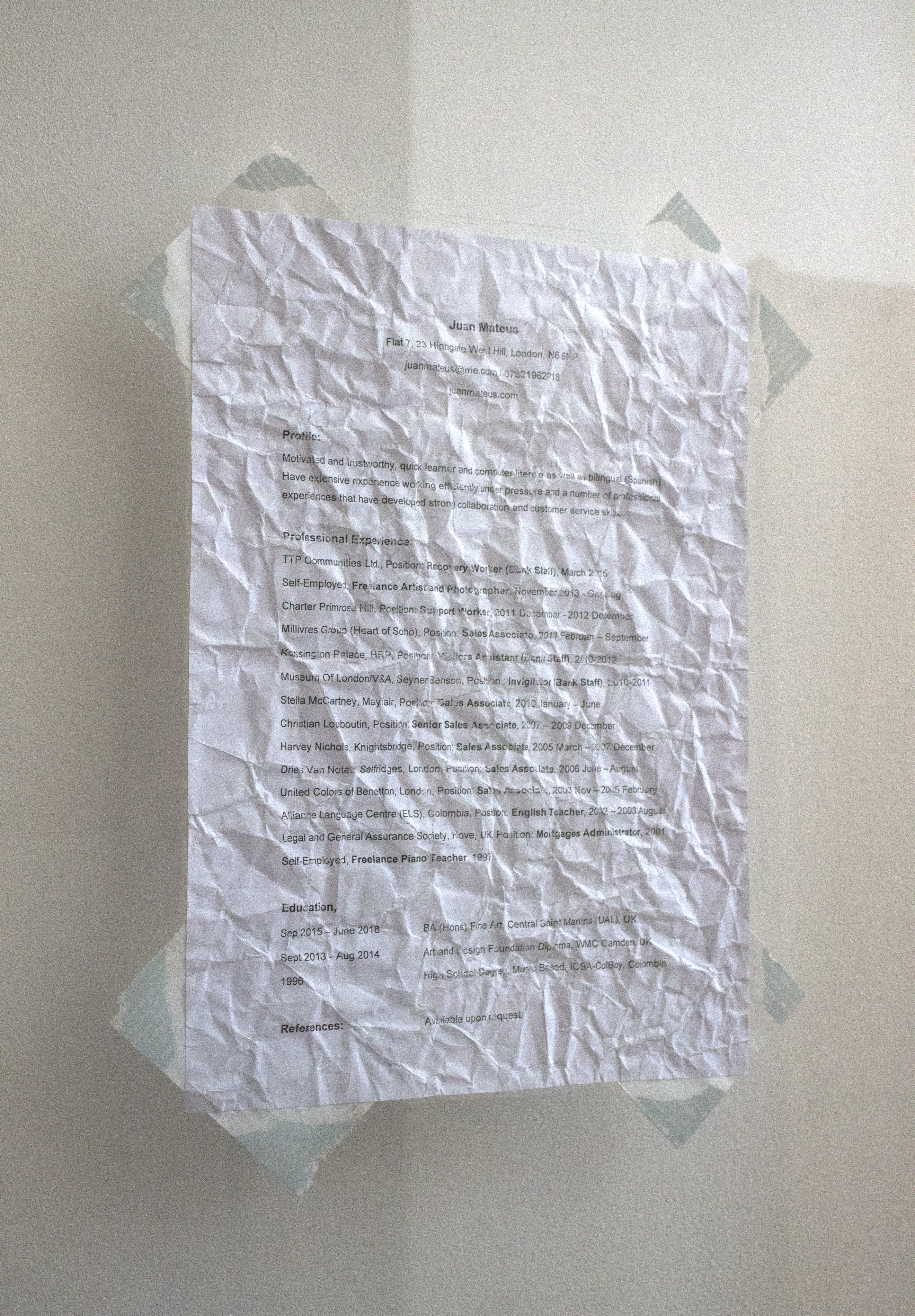 “i am scared you are not going to get me” (detail), 2015. CV, duct tape and found framed glass